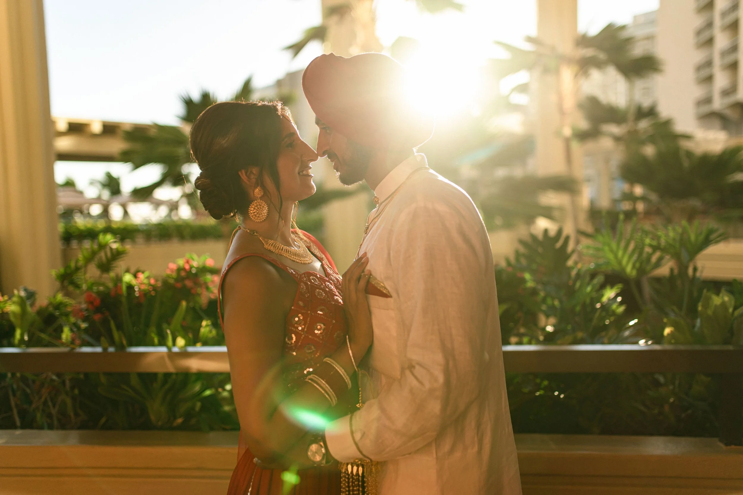 At the Hyatt Regency Oʻahu, an exquisite Indian wedding unfolded with the elegance of tradition framed by Hawaiʻi’s tropical beauty. The bride’s crimson lehenga, adorned with intricate gold embroidery and heirloom jewelry, glowed against the lush backdrop of palms and ocean. Beside her, the groom’s refined white kurta and bold red turban created a striking balance of simplicity and regality. Together, their presence embodied both cultural heritage and modern sophistication, a union as timeless as the waves just beyond the terrace.
