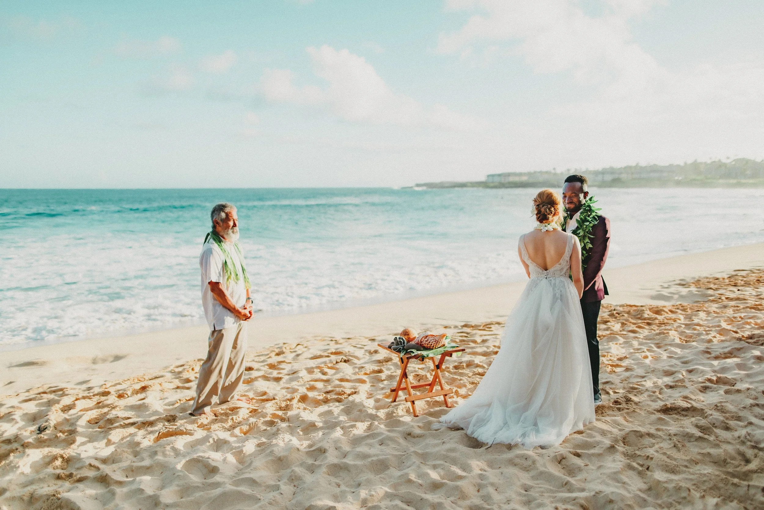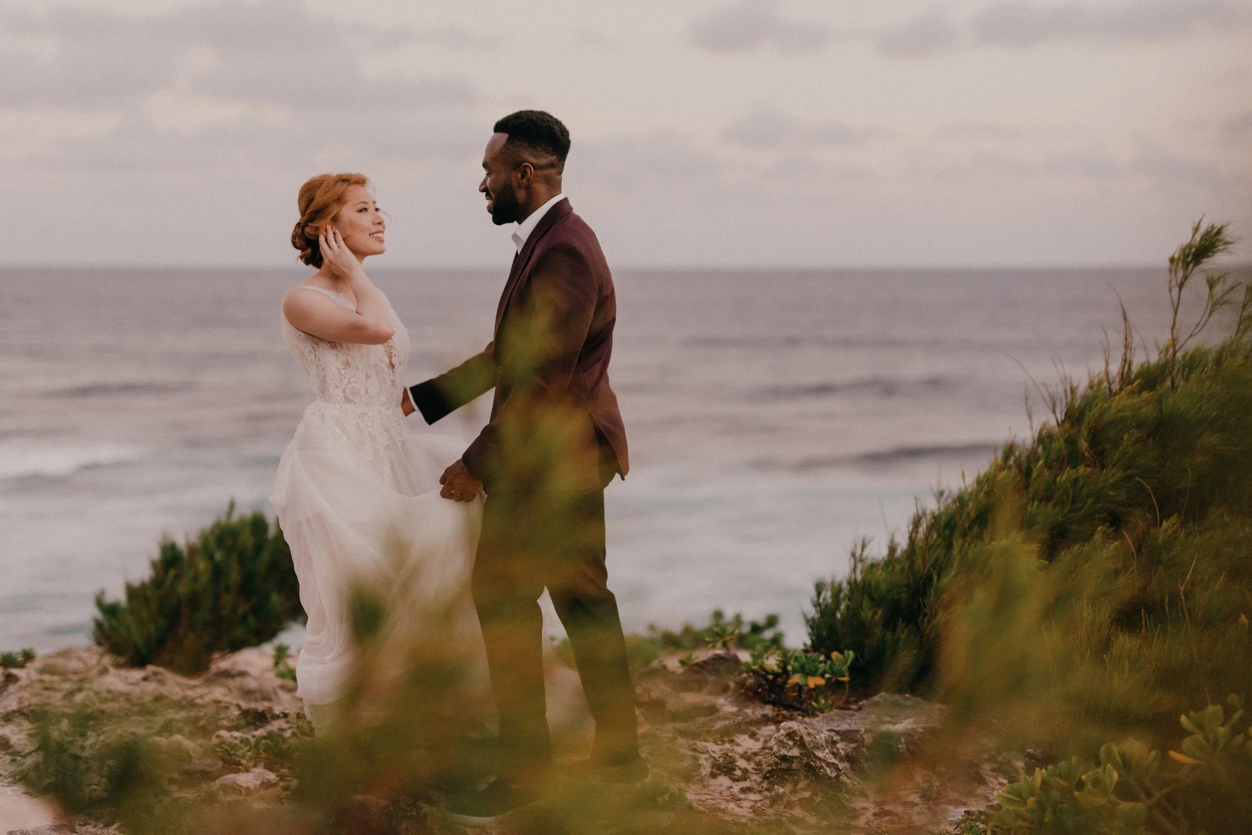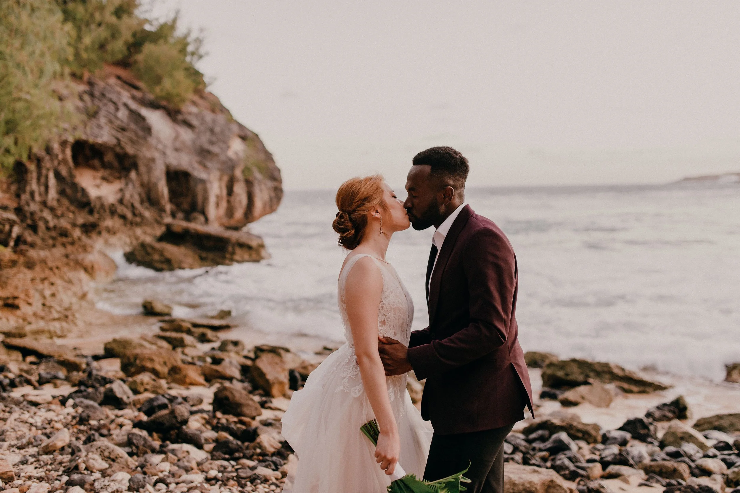 This Waimea Valley wedding seamlessly fused boho romance with a whimsical starry night theme, creating a celebration that was both playful and refined. The bride’s delicate lace wedding dress and the groom’s tailored blue suit paired perfectly with celestial-inspired details, from watercolor starry-night invitations to twinkling décor accents. A white wedding bounce house added a joyful, unexpected twist, giving guests a chance to laugh and play against the backdrop of Oʻahu’s lush rainforest.